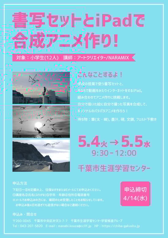 好評につき千葉市生涯学習センターでの実施3回目となりましたお習字セットを使ったパラパラアニメワークショップです。 今回はタブレットが大活躍します。iPadの動画編集ソフトを使ってパラパラアニメーションを自分で撮影した映像(又は写真)と合成してかっこいい作品をつくろう! 申し込み可能期間が4/1〜4/14までと短いのでお早めに!