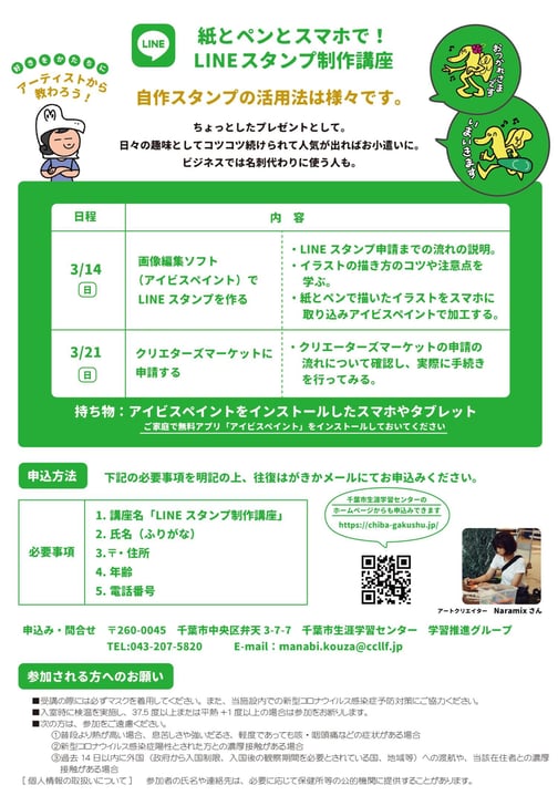 無料画像編集ソフト(アイビスペイント)を使い、自分が描いた絵でLINEスタンプを作る講座です。