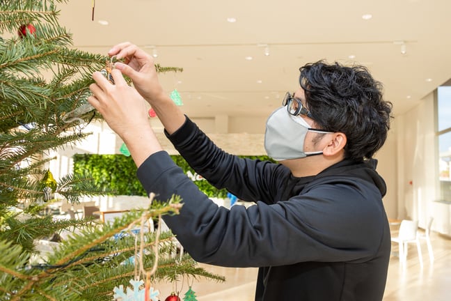 クリスマスに先駆けてツリーに会場に来たお客さんと、願い事をかいたオーナメントを飾りました。
